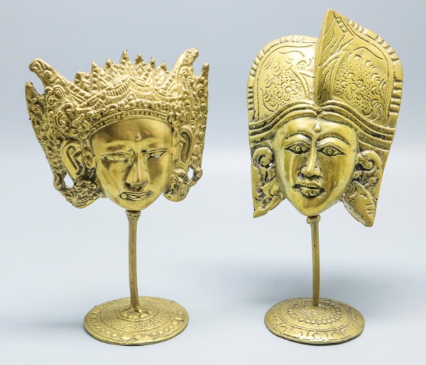 • ESCULTURA - Par de máscaras balinesas em metal dourado, lavrada e cinzelada. Med. 17x12 cm e 13x10 cm. Pequenas faltas das pedras.