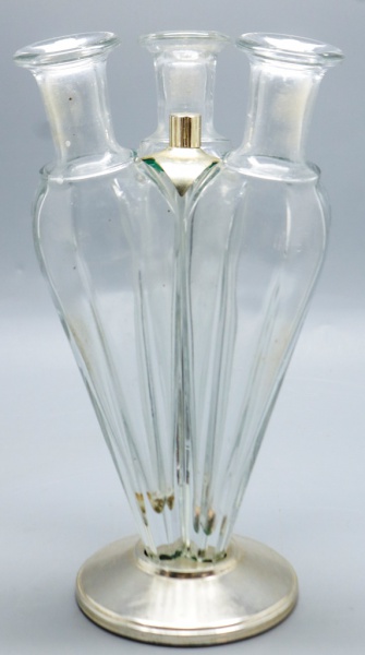 • DEMI CRISTAL - Licoreira tríplice em demi cristal incolor, base em metal espessurado a prata, sem as tampas. Anos 50. Alt. 26 cm.