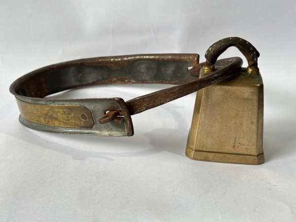 • COLECIONISMO - Antigo cincerro ou sino de vaca antigo com um colar, também conhecido como campana ou chocalho. Marcas do tempo e de uso.
