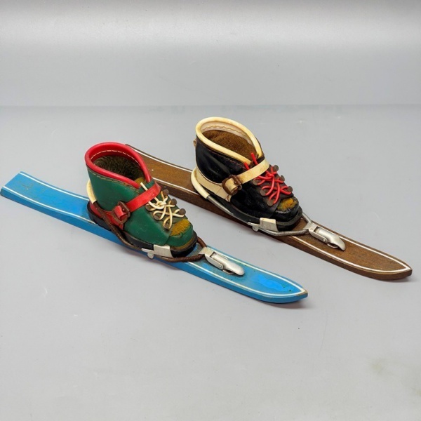• DIVERSOS - Par de esquis em miniatura, com botinhas em couro, cores diferentes, esquis em madeira. Marcas do tempo e de uso.