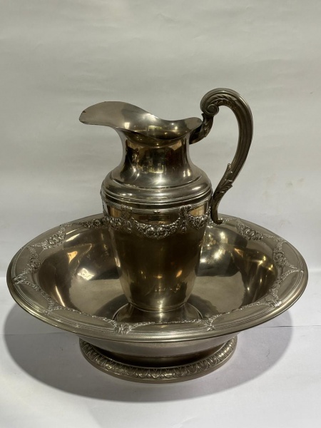 • METAL - Antigo GOMIL (Bacia e jarra) em metal espessurado a prata, decorado com guirlandas em relevo. Apresenta amassados e desgastes do tempo.