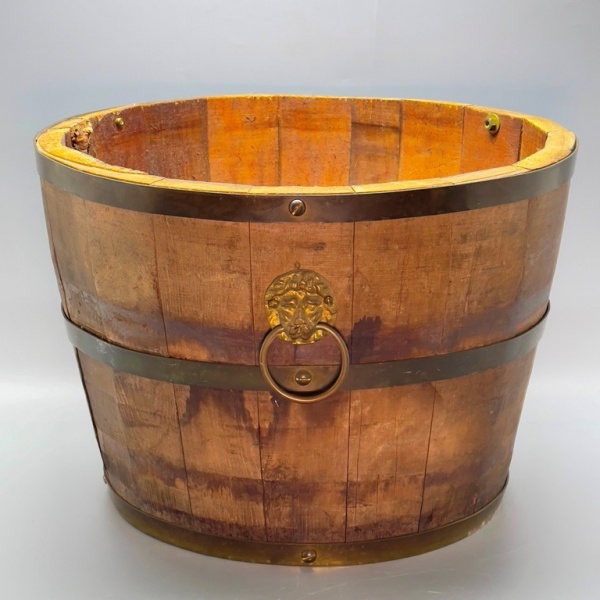 • DIVERSOS - Antigo cachepô meio tonel/barril em madeira nobre e aros em metal, alças com cara de leão. Med. 27x40 cm.