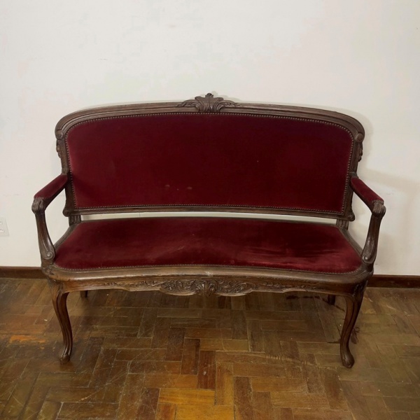 • MOBILIÁRIO - Antigo sofá de 2 lugares em madeira nobre, estofado em veludo vinho. Med. 100x127x49 cm. Necessita restauro no estofamento, vestigios de antigo ataque de cupins. Móveis Usados - Lote de móvel antigo e usado, podendo apresentar marcas de uso e desgaste natural do tempo. Há possibilidade de danos ocultos e ou outras imperfeições.  Não há garantia ou possibilidade de devolução após a aquisição. Recomenda-se inspeção prévia.