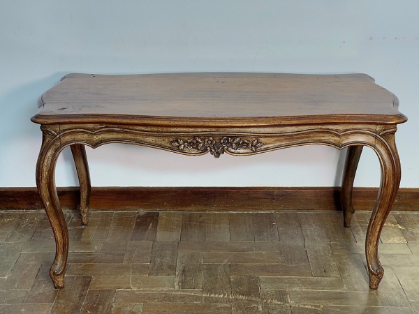 • MOBILIÁRIO - Mesinha de centro no estilo inglês, ricos entalhes em madeira maciça. Med. 44x87x50 cm. Móveis Usados - Lote de móvel antigo e usado, podendo apresentar marcas de uso e desgaste natural do tempo. Há possibilidade de danos ocultos e ou outras imperfeições.  Não há garantia ou possibilidade de devolução após a aquisição. Recomenda-se inspeção prévia.