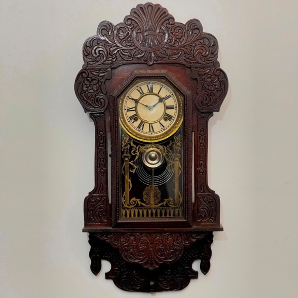 • RELÓGIO - Relógio de parede da marca "Ansonia". Caixa em madeira nobre entalhada com florão em formato de concha. Vidro da porta em pintura jateada. E.U.A. Med. 73x35x10 cm. Com chave e pêndulo.  Não testado e sem garantia.