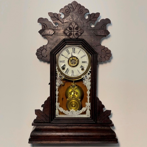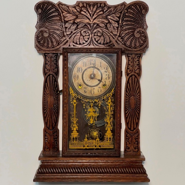• RELÓGIO - Relógio de parede da marca "Ansonia". Caixa em madeira nobre entalhada. Vidro da porta em pintura jateada. E.U.A. Med. 58x37x13 cm. Pêndulo decorado em relevo, representando castelo. Não testado e sem garantia.