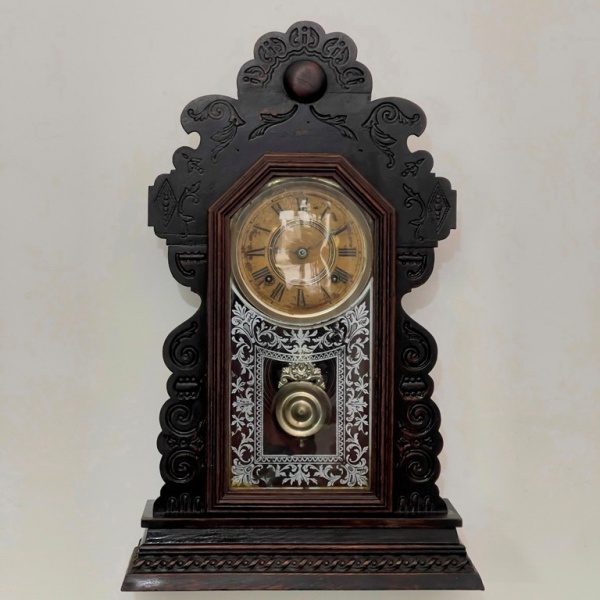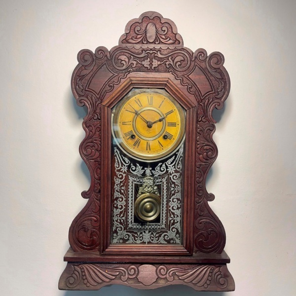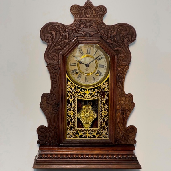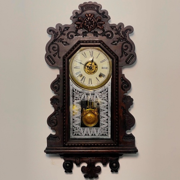 • RELÓGIO - Relógio despertador de parede da marca "Ansonia". Caixa em madeira nobre entalhada. Vidro da porta em pintura jateada. E.U.A. Med. 64x33x12 cm. Com chave e pêndulo.  Não testado e sem garantia.