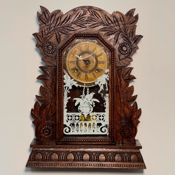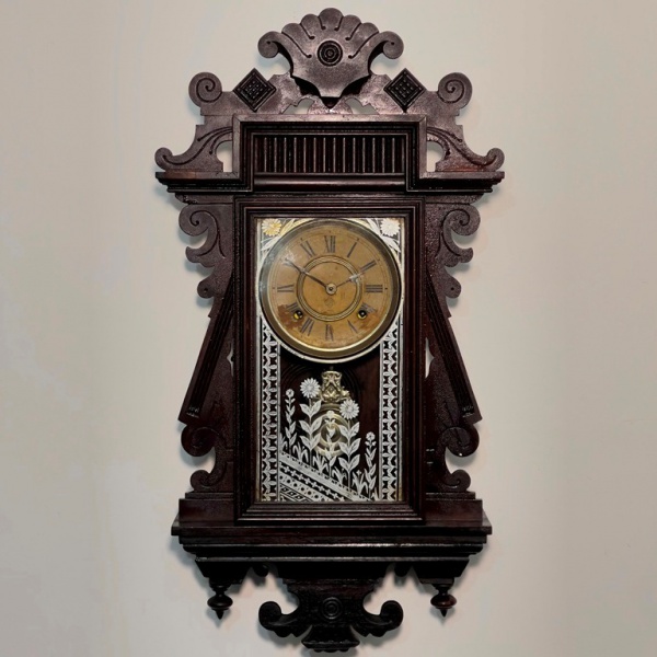 • RELÓGIO - Relógio de parede da marca "Ansonia". Caixa em madeira nobre entalhada. Vidro da porta em pintura jateada. E.U.A. Med. 52x38x13 cm. Sem chave.  Não testado e sem garantia.