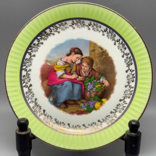 • PORCELANA - Prato decorativo em porcelana francesa, LIMOGES decorada com cena central de mulheres colhendo frutos, faixa verde e frisos dourados. Dia. 24,5 cm.