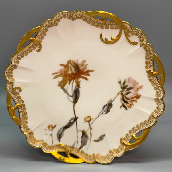 • PORCELANA - Prato decorativo em porcelana francesa, LIMOGES, decorada com flores policromadas, borda vazada e ricamente dourado. Dia. 23 cm.