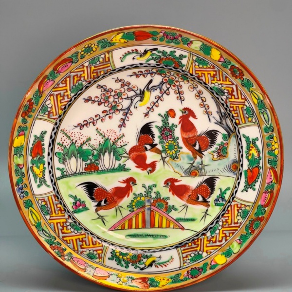 • PORCELANA - Prato decorativo em porcelana oriental, decorada com galinaceos policromados. Dia. 18 cm.