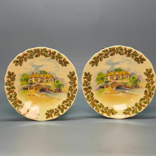 • PORCELANA - ROYAL DOULTON - Par de pratos decorativos em porcelana com decorados com motivo de fazenda e ponte, policromado e borda com bolotas. Med. 15 cm.