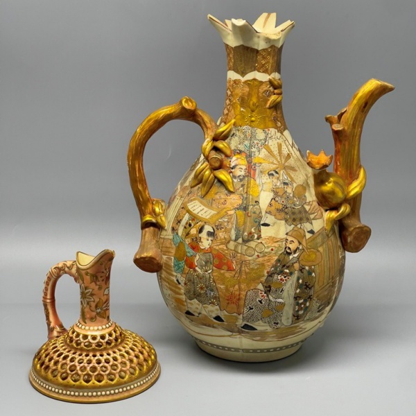 • PORCELANA - Lote de lindo bule em porcelana, estilo SATSUMA, alça e bico em formato de tronco, relevo de frutos e folhagens, ricamente decorado com cenas do cotidiano, borda com 6 pontas (quebradas) e jarrinha ricamente policromada com flores , base com estilo rendado, vazado, bico da jarra (quebrada). Med. 27 cm e 11 cm. Ambas as peças quebradas.
