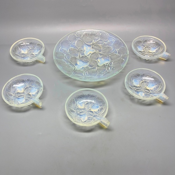 • DEMI CRISTAL - Conjunto de sobremesa, tigela e 5 potinhos para servir em demi cristal franês decorado com folhas em relevo, delicadamente opalinada. Med. 4x24 cm e 3x13x11 cm.
