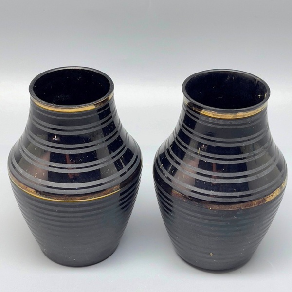 • DEMI CRISTAL - Par de vasos floreiras, estilo Art Decô em demi cristal, preto com faixas douradas. Med. 11 cm. Marcas do tempo e de uso.