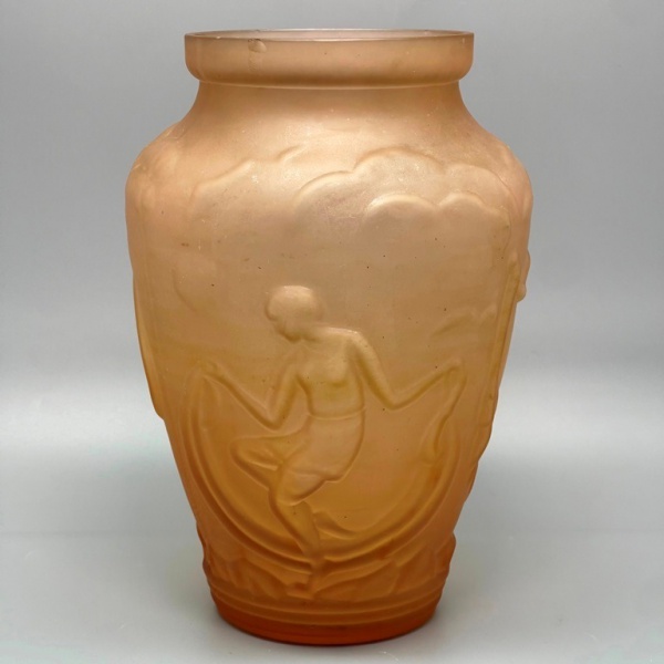 • DEMI CRISTAL - Vaso floreira Art Decô, decorada com cena de dançarina, rose. Med. 23x14x11 cm. Lascado na borda.