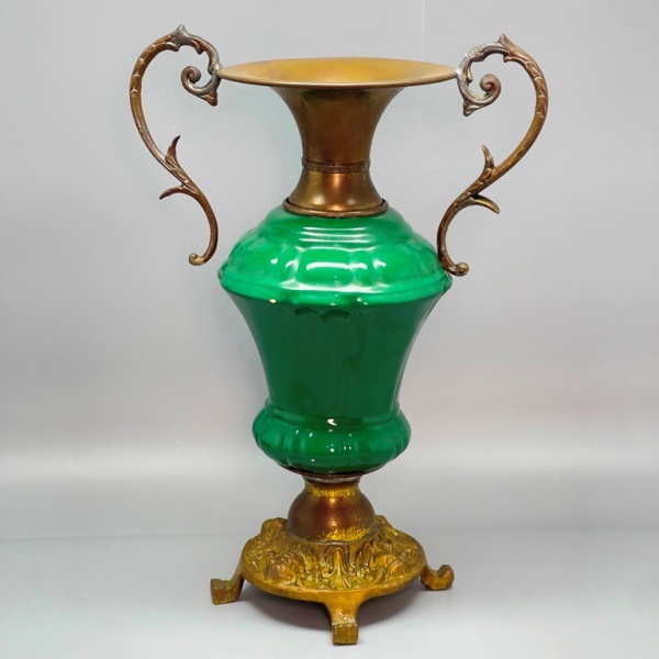 • METAL - Antigo samovar em metal dourado. Med. 49x25x17 cm. Pátina natural.