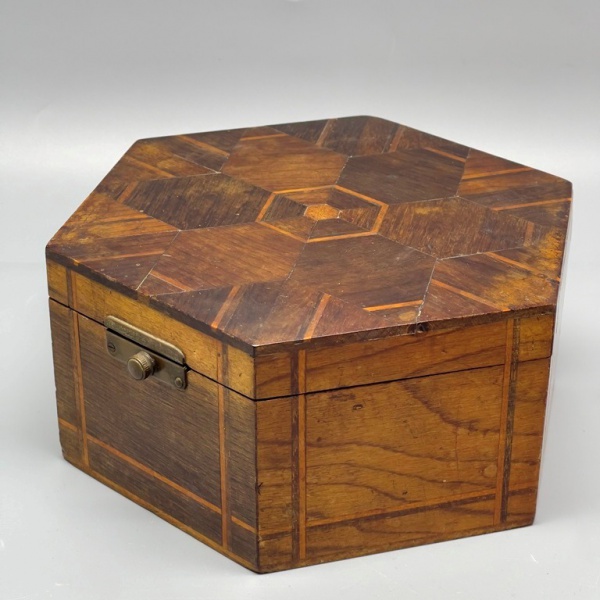 • DIVERSOS - Linda porta joias sextavado, ricamente marchetada. Med. 8x18 cm.