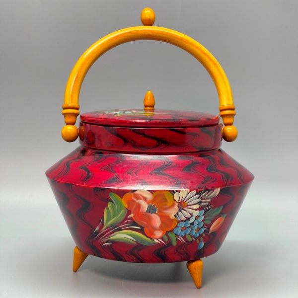 • DIVERSOS - Antigo potiche estilo oriental em madeira, laqueada com flores, base em vermelho e preto. Med. 17x20 cm.