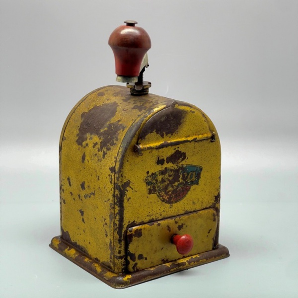 • DIVERSOS - Antigo moedor de café em lata. Med. 20x12x20 cm. Marcas do tempo e de uso.