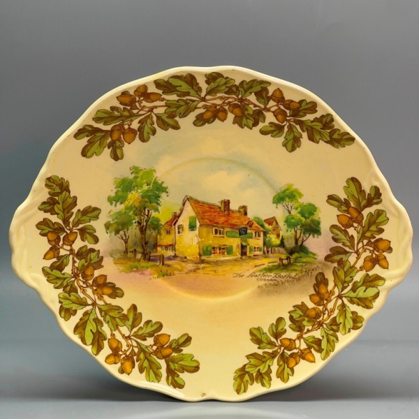 • PORCELANA - ROYAL DOULTON - Prato decorativo com decoração de casario, folhagens e frutos. Med. 23x25 cm.