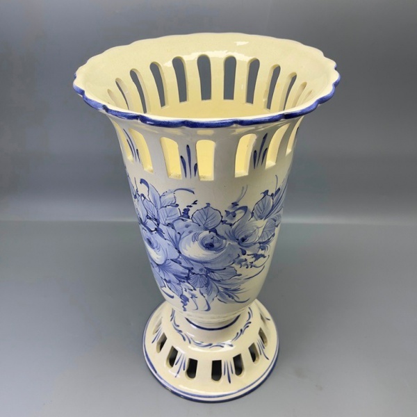 • FAIANÇA - Grande vaso floreira azul e branco, decorado com motivos florais e vazados. Med. 33x19 cm.