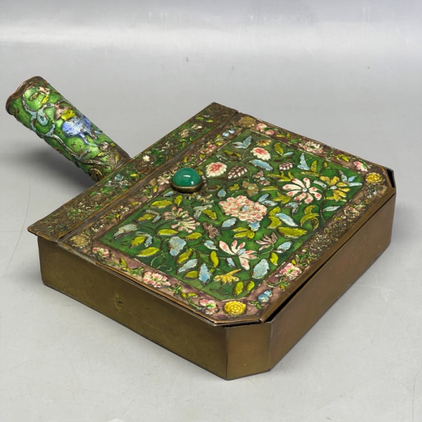 • METAL - Lindo cata migalhas em metal dourado, decorado com flores esmaltadas e policromadas. Med. 6x20x15 cm.