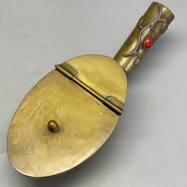 • METAL - Lindo cata migalhas em metal dourado, oval, com aplicação de coral na alça . Med. 7x22x9 cm.