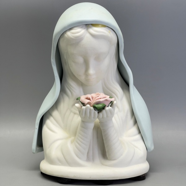 • BISCUIT - Delicada Nossa Senhora segurando rosa em biscuit. Med. 19x14x10 cm.