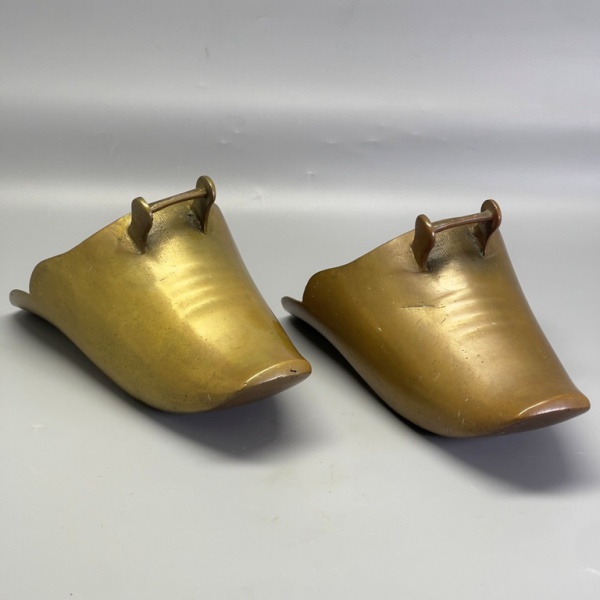 • METAL - Par de estribos em forma de sapata em metal dourado. Med. 15x23x12 cm. Marcas do tempo e de uso.