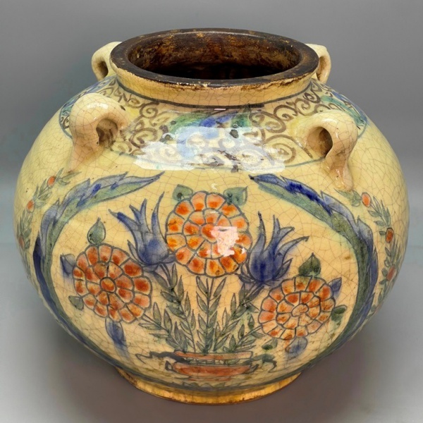 • CERÂMICA - Antigo cachepô em cerâmica esmaltada e vitrificada decorada com motivos florais policromados. Med. 25x25 cm.