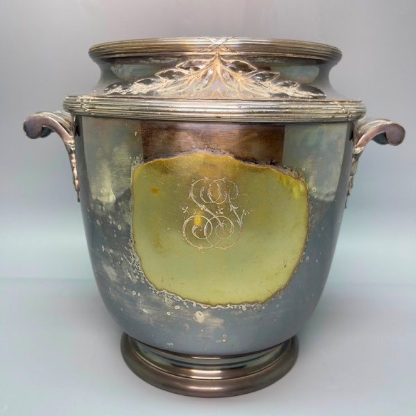 • METAL - Bela e antiga champanheira europeu, espessurado a prata, monogramado SS, borda e alças em relevo. Med. 22x26 cm.