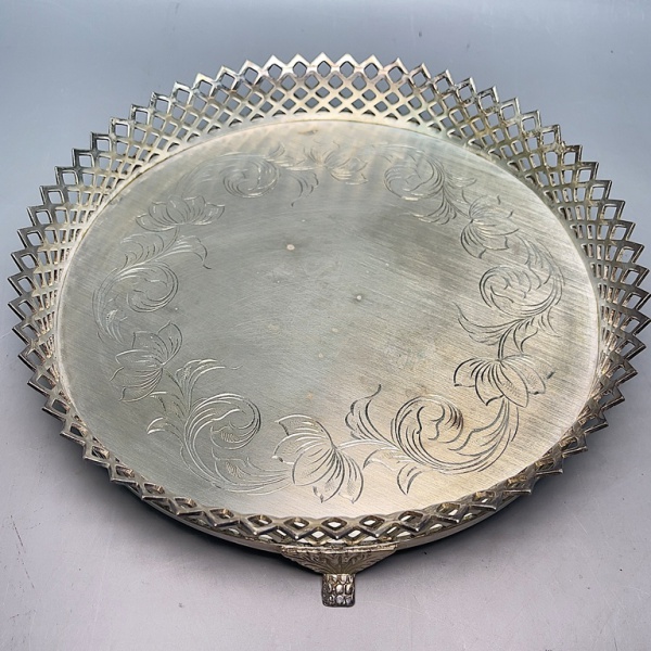 • METAL - Salva em metal espessurado a prata, funda lavrado com galeria vazada. Med. 5x24 cm.