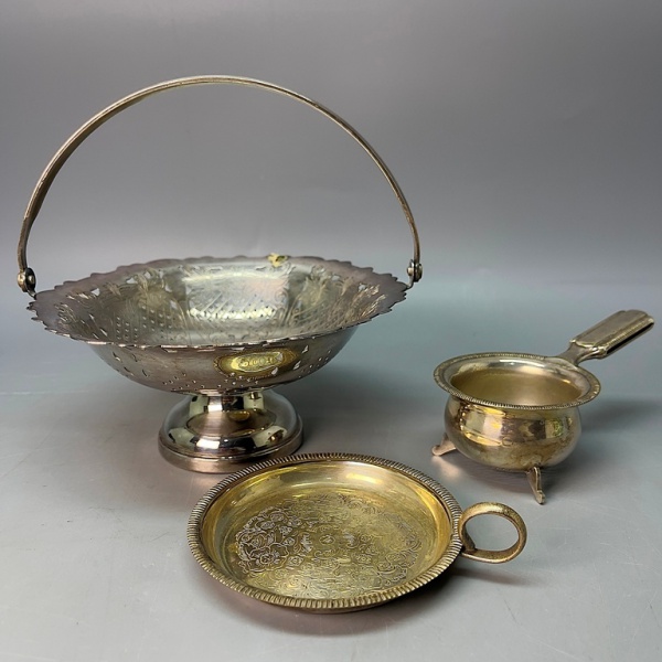 • METAL - Pequeno cesto e coador de chá em metal espessurado a prata.