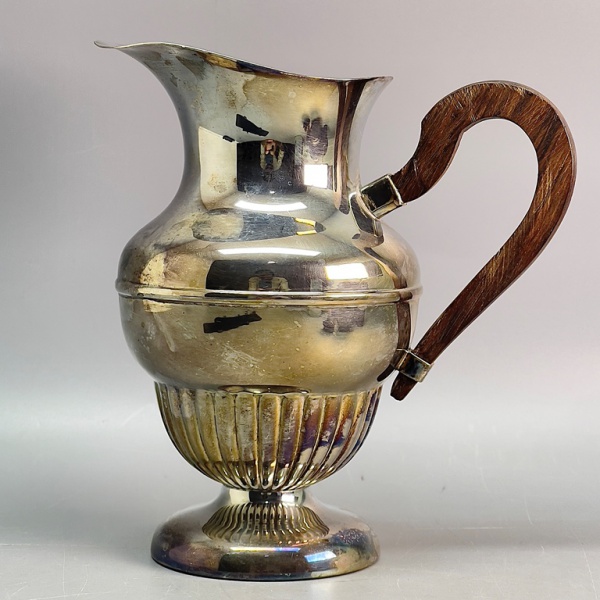 • METAL - Jarrinha em metal espessurado a prata com cabo em madeira. Med. 16 cm.