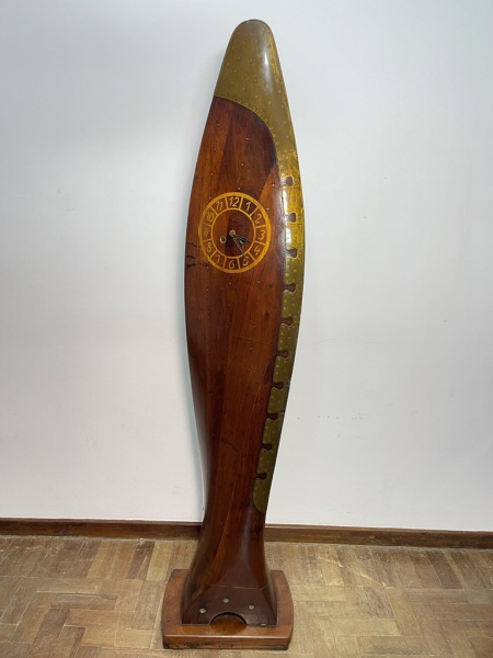 • COLECIONISMO - Rarríssimo relógio feito em original hélice de ZEPPELIN, marchetado e incrustrado com metal dourado. Med. 172x35 cm. Não testado e sem garantia.