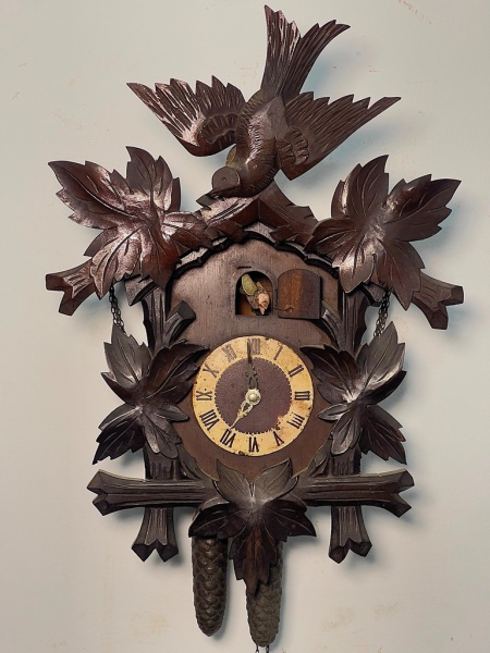 • COLECIONISMO - Antigo relógio Cuco, caixa em madeira nobre, mostrador em algarismos romanos. Med. 45x31x13 cm. Não testado e sem garantia.