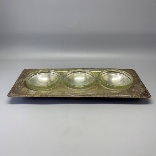 • DEMI CRISTAL - Petisqueira em metal espessurado a prata com 3 recipientes em demi cristal. Med. 2x40x17 cm.