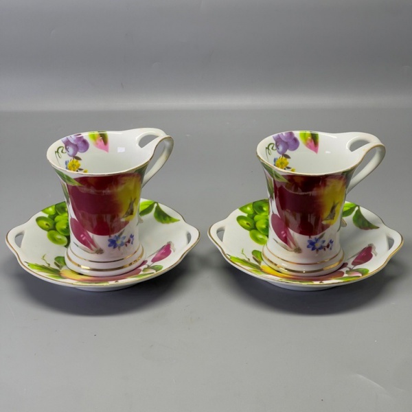 • PORCELANA - Lote de canecas decoradas com frutas polocromadas. Med. 10 cm e 15 cm.