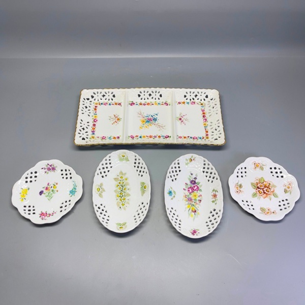 • PORCELANA - Conjunto de petisqueiras em porcelanas brancas, pintadas a mão, motivo de flores, vazadas. Med. 31x15 cm e 13 cm. Total de 5 peças.