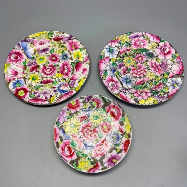 • PORCELANA - FAMILIA ROSA - Lote de 3 pratos em pasta de porcelana chinesa esmaltado nos esmaltes "Família Rosa", farta decoração floral. Med. 15 cm e 12 cm.