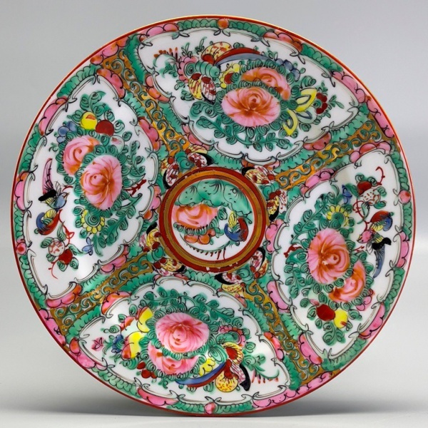 • PORCELANA - FAMILIA ROSA - Lote de 1 prato em pasta de porcelana chinesa esmaltado nos esmaltes "Família Rosa", farta decoração floral. Med. 21 cm.