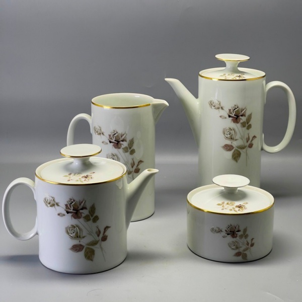 • PORCELANA - Parte de jogo de chá e café em porcelana branca, decorada com motivo floral e friso dourado. Composto de: Bules, leiteira, açucareiro. Med. 24x20 cm e 12x10 cm.