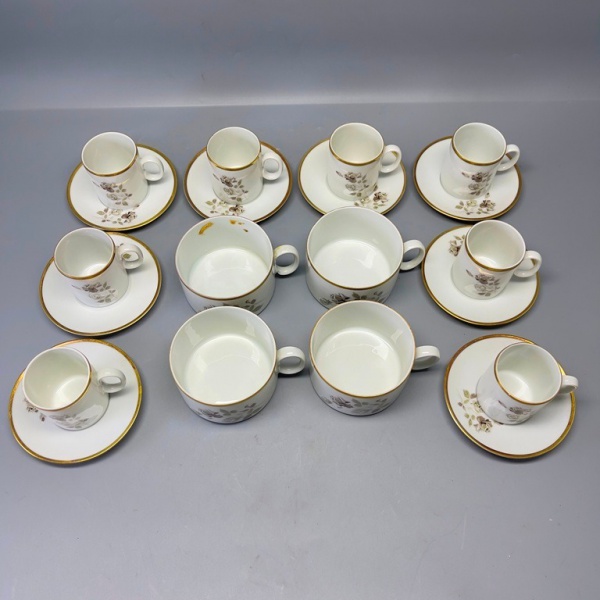 • PORCELANA - Parte de jogo de chá e café em porcelana branca, decorada com motivo floral e friso dourado. Composto de: 8 xícaras de café e 4 xícaras de chá. Med. 5x10x8 cm, 5x6x5 cm e 10 cm.