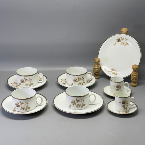 • PORCELANA - Parte de jogo de chá e café em porcelana branca, decorada com motivo floral e friso prateado. Composto de:  2 xícaras de café, 4 xícaras de chá e 2 pratos. Med. 5x10x8 cm, 5x6x5 cm, 10 cm, 15,5 cm e 18 cm.