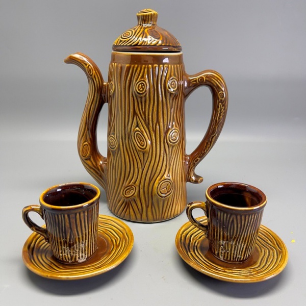 • CERÂMICA - Bule decorado em formato de tronco acompanha 2 xícaras. Med. 14 cm. 6 cm e 10 cm.