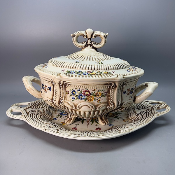• PORCELANA - Sopeira com presentoir e colher. Med. 35x36x21 cm. Concha quebradd. Med. 45x30 cm.