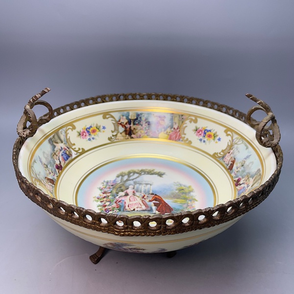 • PORCELANA - Bela fruteira decorada com cenas galantes, guarnecida em bronze. Med. 20x27 cm.