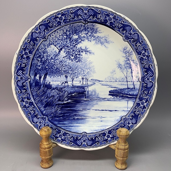• PORCELANA HOLANDESA - DELFT BLUES - Antigo prato de coleção em porcelana holandesa, nas cores azul e branco decorado por paisagem. Dia. 30 cm.