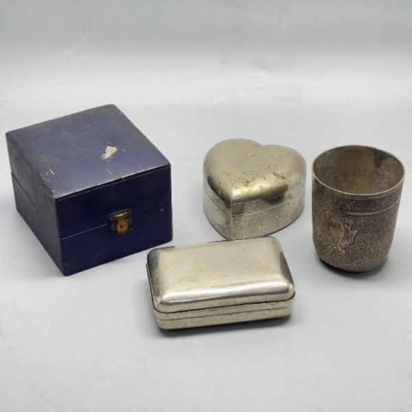 • METAL - Lote de 3 peças em metal espessurados a prata. Sendo 2 porta joias e 1 copo. Marcas do tempo, de uso e desgastes.